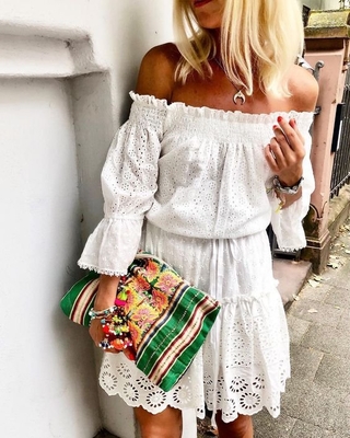 Off Shoulder Casual 3/4 Sleeve Ruffled Auto-Clearance is fashionable & cheap, come to Noracora to find out about the Clothing