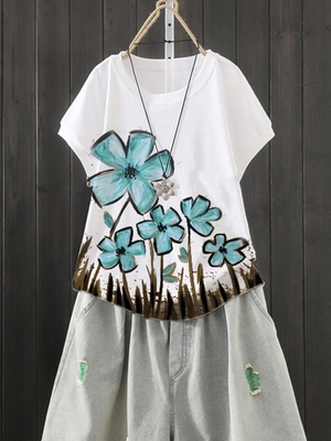 White Casual Cotton-Blend Floral T-Shirts is fashionable & cheap, come to Noracora to find out about the Clothing