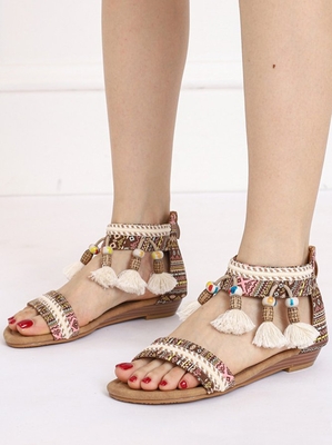 Women Boho Ethnic Summer Tassel Daily Flat Heel Round Toe PU Pu Slide