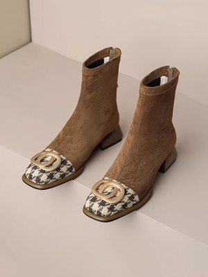 Women Houndstooth Autumn Elegant Metal Zipper Party Square Toe Fabric