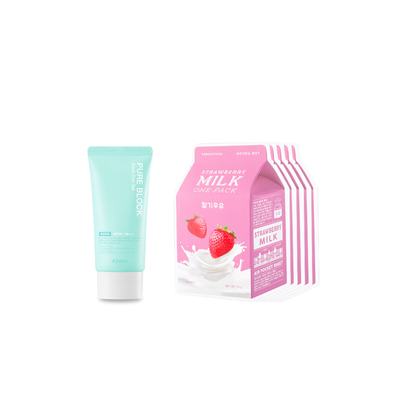 A'PIEU - Milk One Pack Sheet Mask - Strawberry - 5pcs + Pure Block