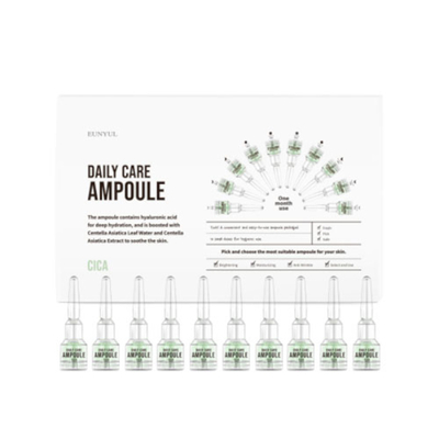 This Daily Care Ampoule Special Set helps improve 5 different skin problems with Cica Vitamin Collagen Hyaluronic Acid & Gold. Delivers deep moisture to skin with 12 kinds of natural ingredients. Contains Niacinamide & Adenosine that help with wrinkle improvement & offer brightening effects. The refreshing texture absorbs fast into the skin with a non-sticky finish. Certified KFDA. Cica: Offers wrinkle improvement & brightening effect. Strengthens skin barrier with Madecassic Acid. Soothes skin with Cica ingredients.
