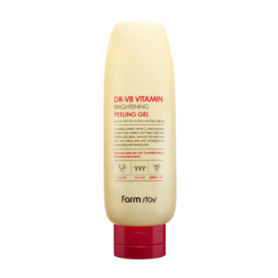 Enhancing shine & even skin tone with a Farm Stay DR-V8 Vitamin Brightening Peeling Gel with a complex of vitamins effectively eliminates skin flaking cleans the skin from impurities excess sebum & dead skin cells the accumulation of which leads to a dull complexion causing black heads & noticeable enlarged pores. The complex of vitamins (C E B5 B3) nourishes the skin cells with energy hyaluronic acid delivers moisture as deeply as possible into the dermisthereby achieving the effect of rejuvenation & tightening of the skin relief. The tool has a whitening effect gives the face a fresh & rested appearance. The effective formula provides full penetration of topical vitamin C into the skin & effectively protects against the harmful effects of free radicals corrects signs of aging. Regular use of the peeling gel improves the skin condition significantlygives smoothness shine & enhances the penetration of the active ingredients of the following care.