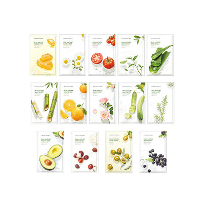 Nature Republic's Real Nature mask pampers your face fully with these sheet masks enriched with cucumber aloe vera bamboo green tea avocado rose tomato royal jelly shea butter & acai berry etc. These masks are saturated with different plant extracts to deliver intense moisture & nutrition.* Send in Random Flavor.