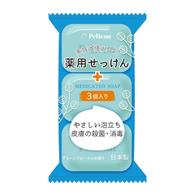 ●A medicated soap has been added to our affordable 3-pack of soaps. ● The medicated soap has been revamped & is now more affordable than ever before making it Pelican Medicated Soap making it even more accessible to everyone.● Disinfects & sterilizes the skin. ● The active ingredients remain the same as before with isopropyl methylphenol & dipotassium glycyrrhizinate sterilizing the skin & preventing irritation. ● The refreshing green floral scent will leave you feeling refreshed.